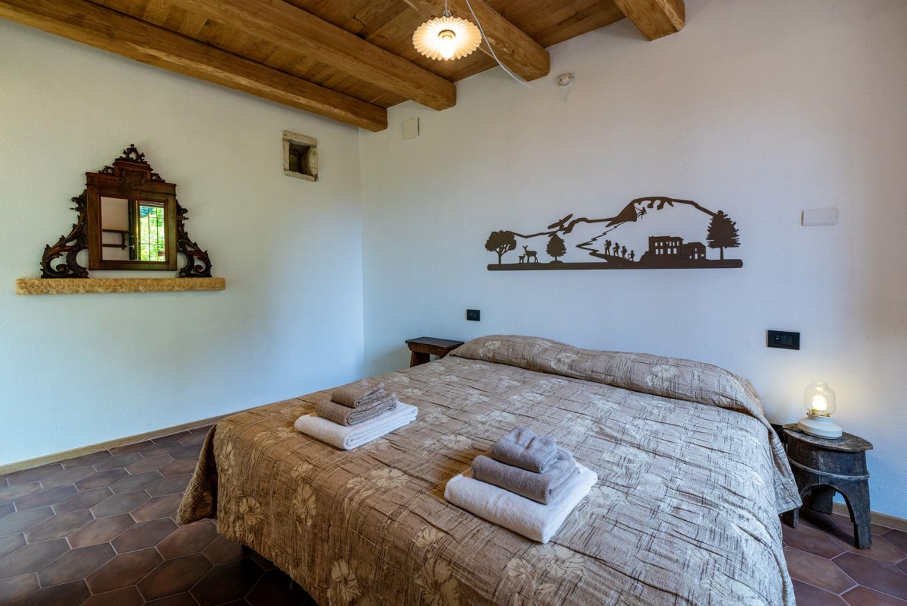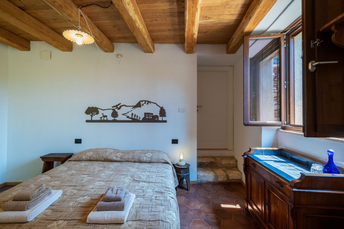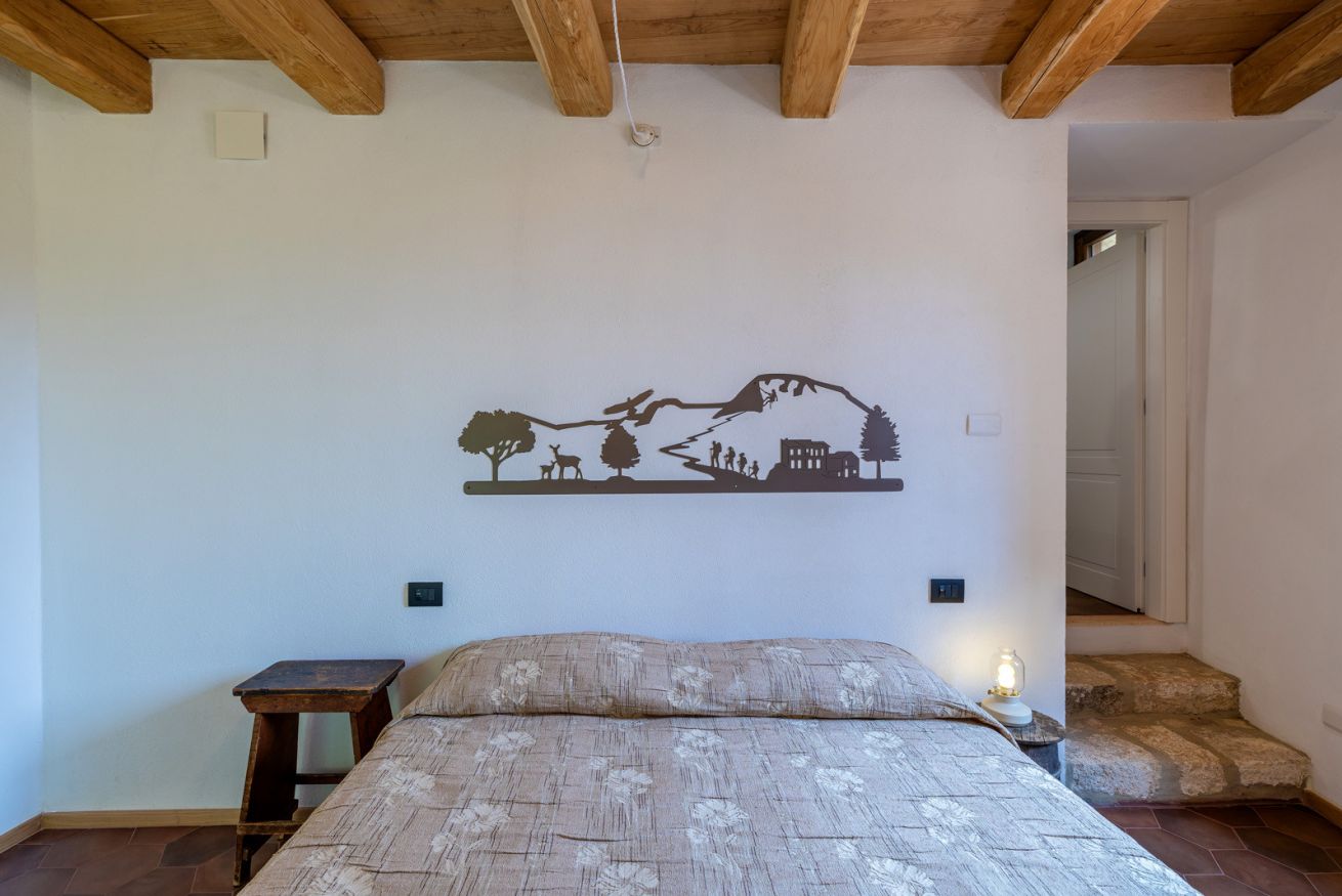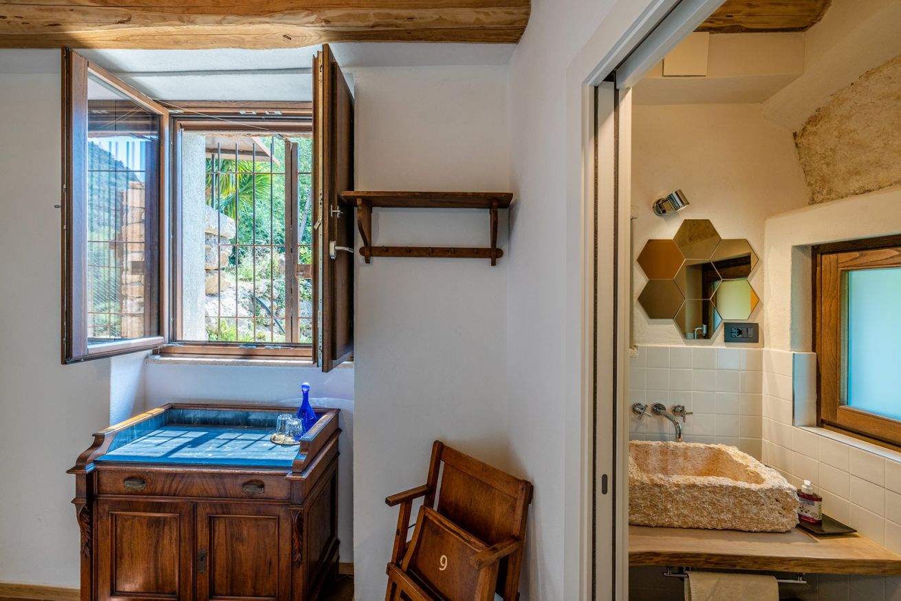 Originali nicchie ricavate nei muri e rivestite in pietra che un tempo sostituivano mobili e armadi, oggi caratterizzano questa stanza assieme a pezzi unici: come la macina in pietra ritrovata negli scavi effettuati durante la ristrutturazione e reinterpretata come comodino; o come il lavandino del bagno, sapientemente ricavato da un blocco di Pietra del Finale.
