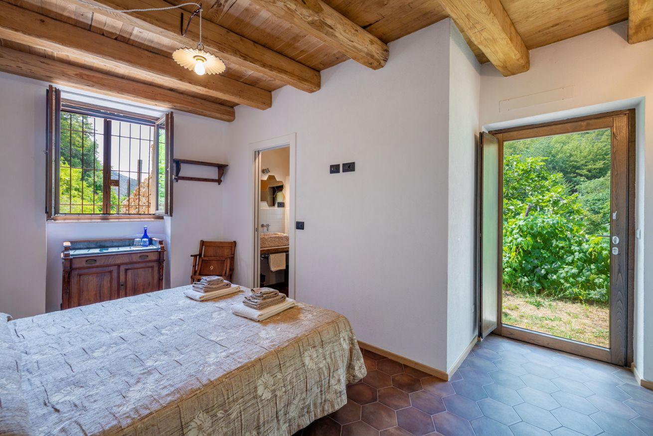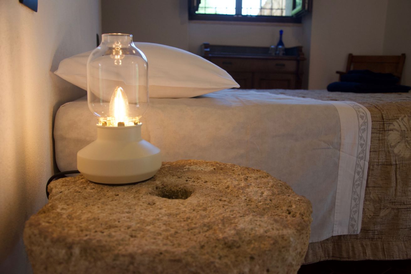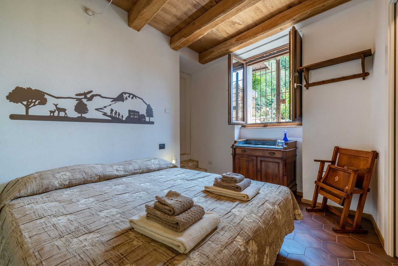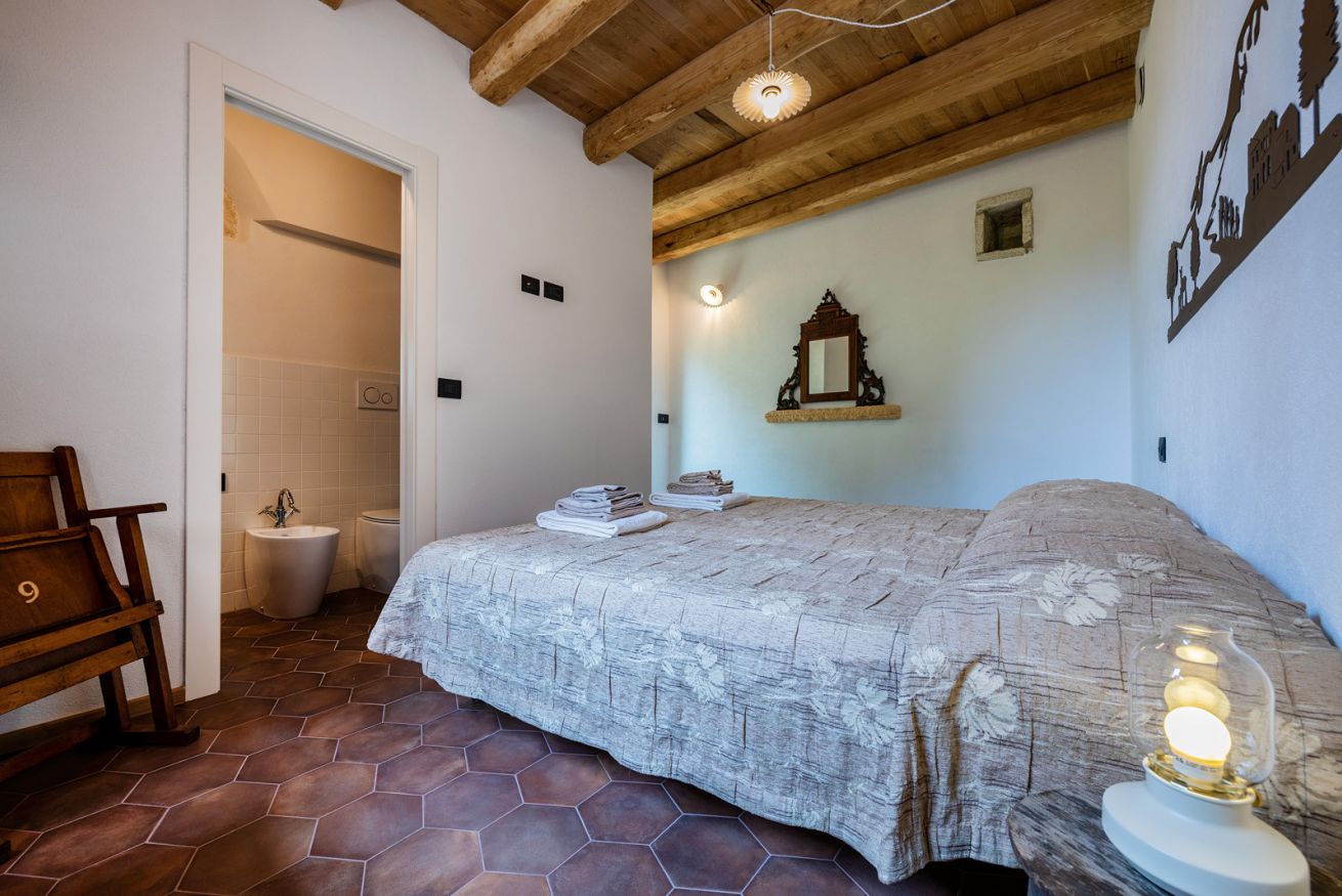 Originali nicchie ricavate nei muri e rivestite in pietra che un tempo sostituivano mobili e armadi, oggi caratterizzano questa stanza assieme a pezzi unici: come la macina in pietra ritrovata negli scavi effettuati durante la ristrutturazione e reinterpretata come comodino; o come il lavandino del bagno, sapientemente ricavato da un blocco di Pietra del Finale.