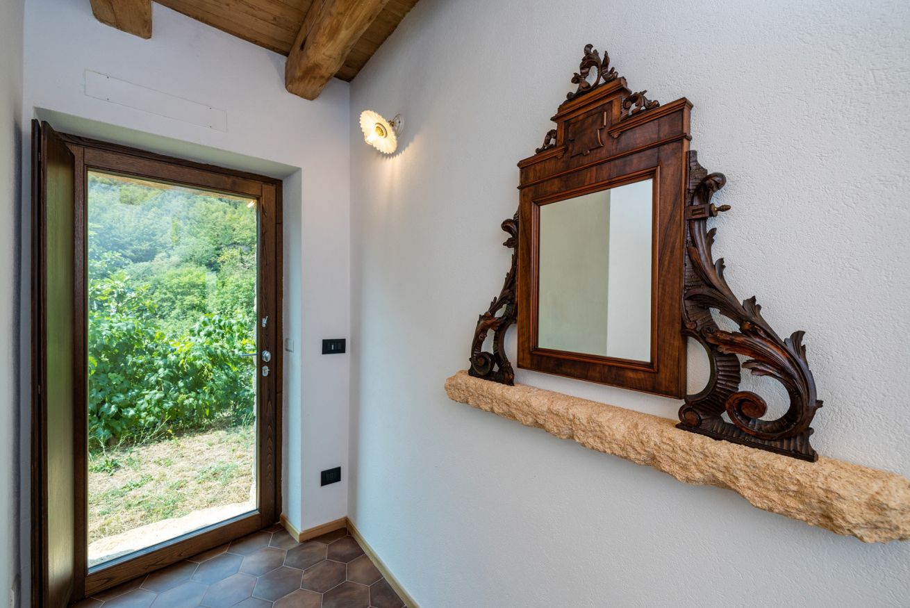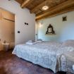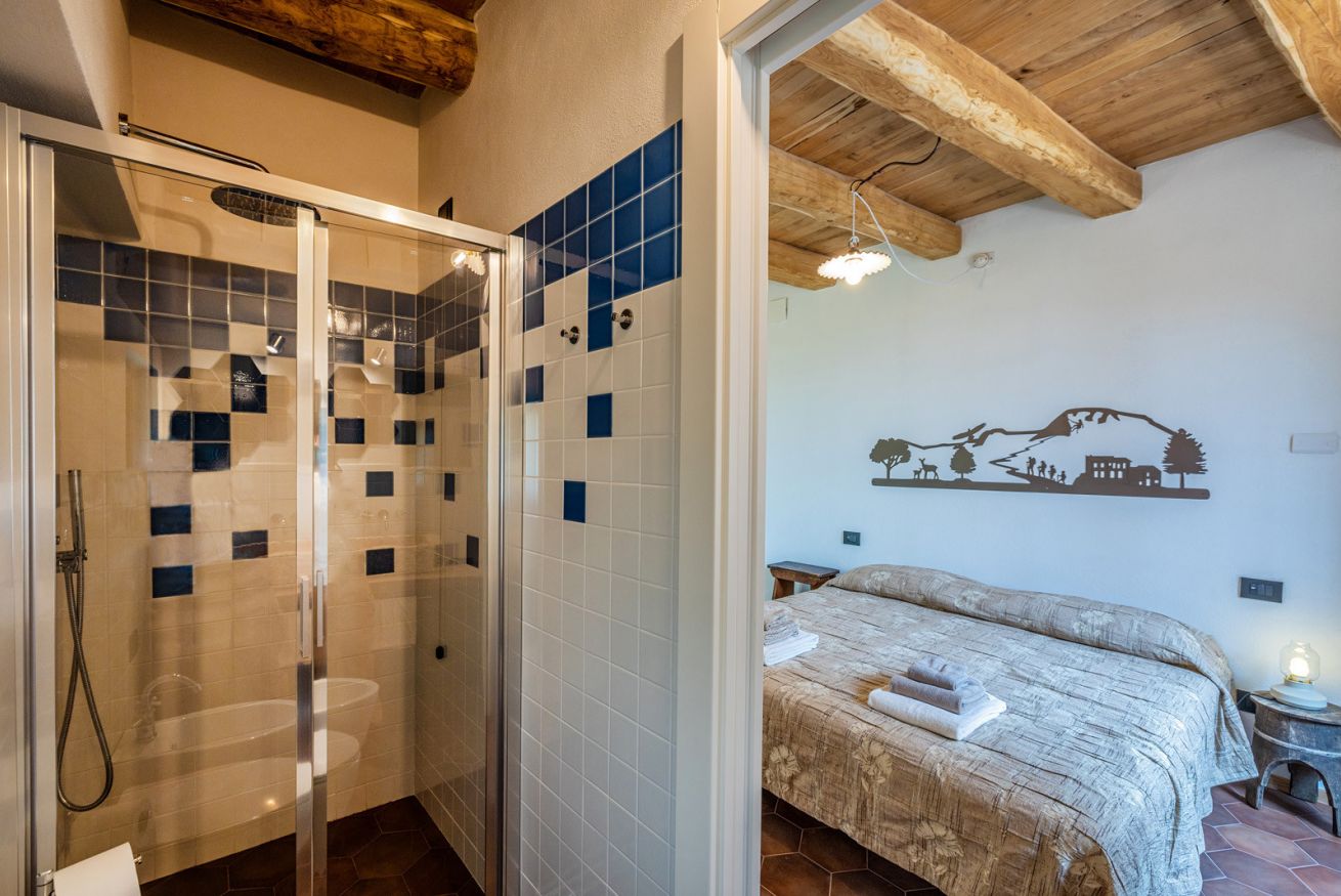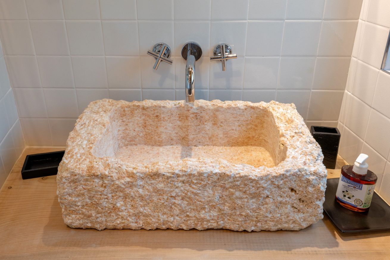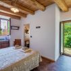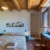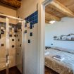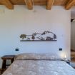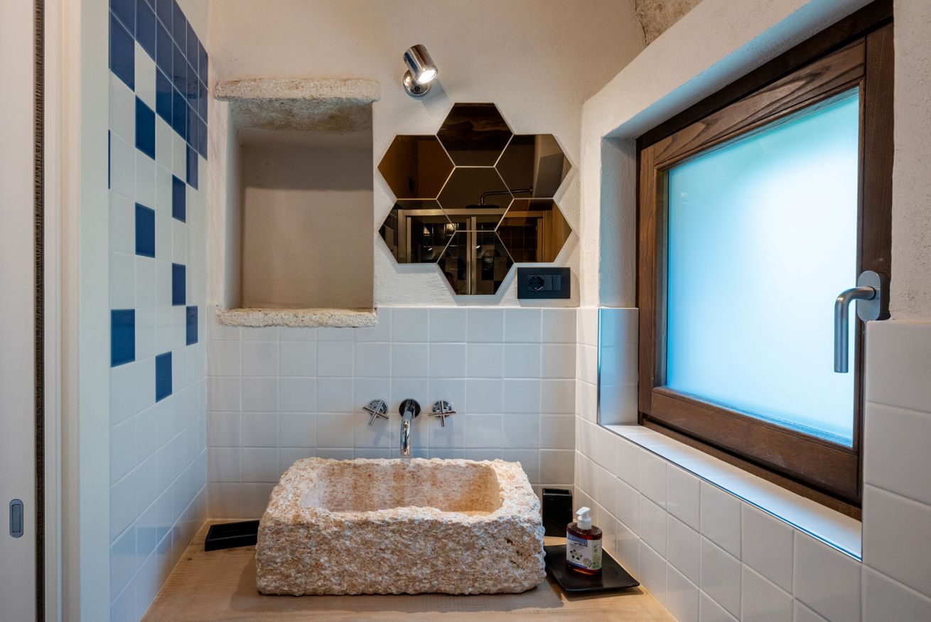 Originali nicchie ricavate nei muri e rivestite in pietra che un tempo sostituivano mobili e armadi, oggi caratterizzano questa stanza assieme a pezzi unici: come la macina in pietra ritrovata negli scavi effettuati durante la ristrutturazione e reinterpretata come comodino; o come il lavandino del bagno, sapientemente ricavato da un blocco di Pietra del Finale.