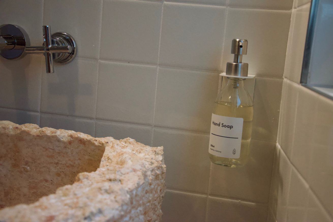 Non troverete kit bagno di cortesia, bensì Shampoo Doccia e Detergente Viso Mani ecologici in dispenser ricaricabili.